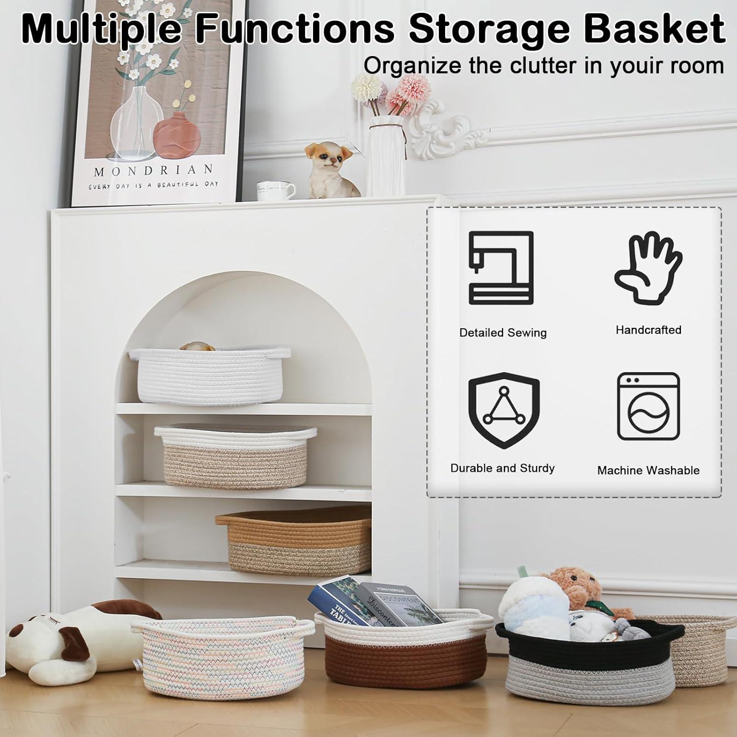 【Multi-Purpose Storage】Woven baskets for storage,bathroom organization, shelf styling,storage basket for organizing snacks, dog cat, magazine, shoes, remotes, books, towels, toiletries, keys and more.Widely used in living room,bedrooms,bathrooms,kids room,and Kitchen